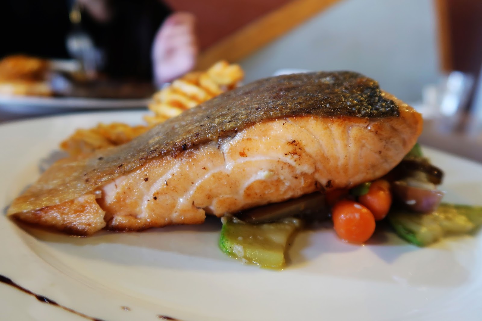 煎三文魚扒伴刁草忌廉汁賣相不錯,厚厚的三文魚伴著大量雜菜及薯格,三文魚煎得非常香口,魚皮薄脆,內層鮮嫩,帶有三文魚獨有的甘香味道。由於我怕熱氣,所以放棄了薯格,當然,若薯格變成薯蓉的話, 這個菜式就更加完美。
