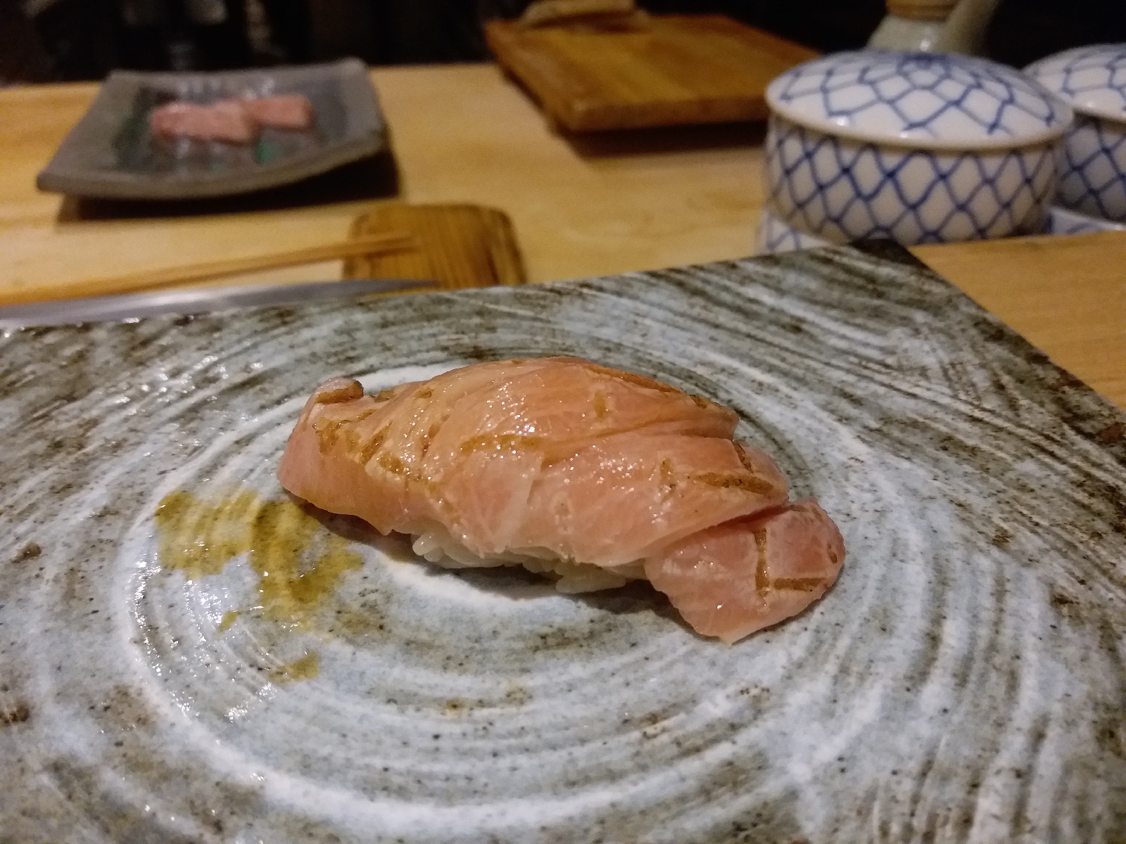 間八其實就是鱆紅魚,師傅以網燒方法將魚皮位置略略燒香,入口有濃濃的炭香味,但又不失刺身鮮嫩感,還有淡淡紫蘇香。