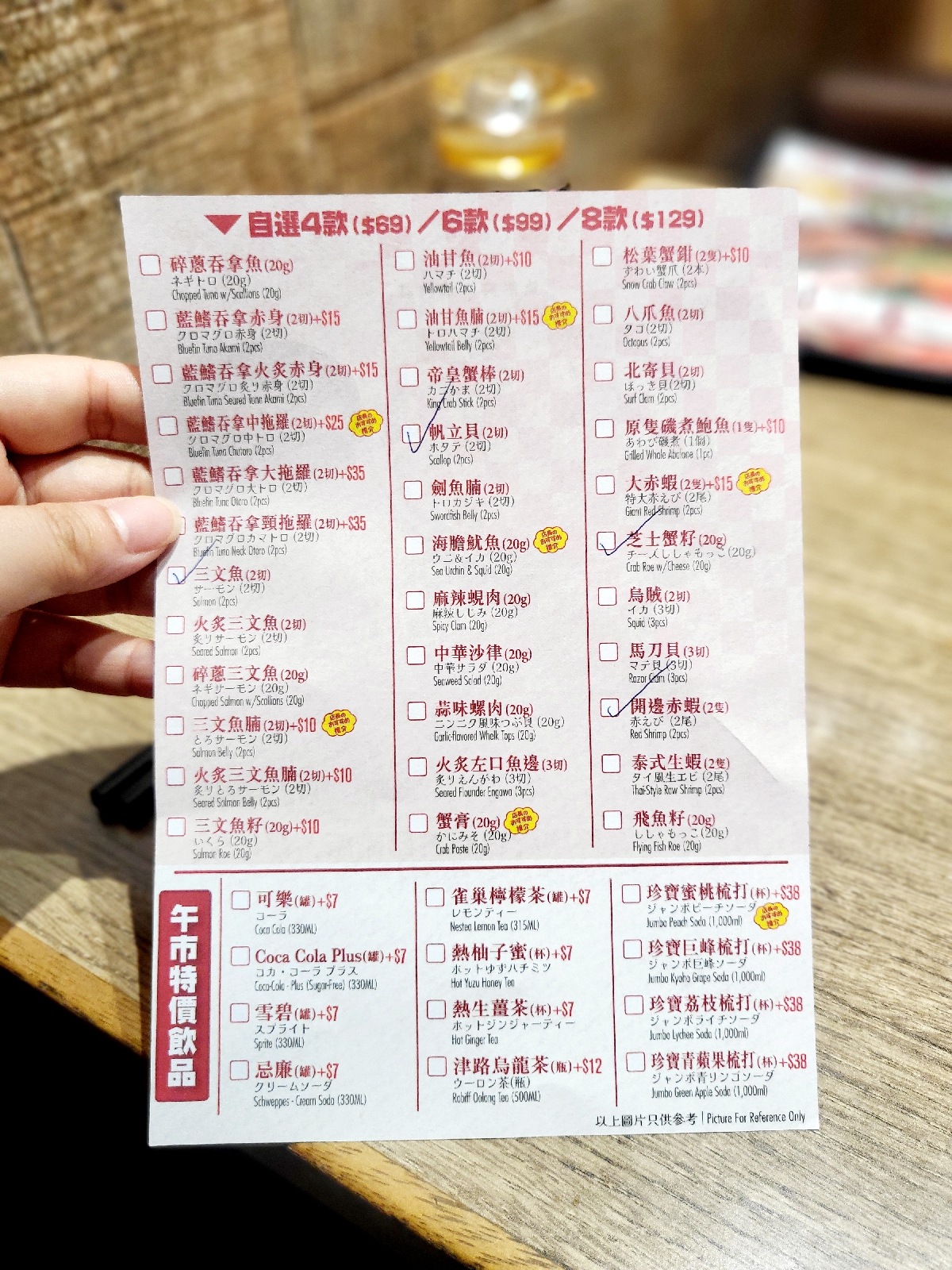 丼飯可點配白飯/壽司飯,可免費追加,跟配味噌湯,而薑味壽司飯、冬菇壽司飯及黑胡椒三文魚飯需要另加錢。魚生選擇極多,部份需加錢點選。